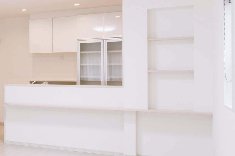 リビングに面した対面キッチンの壁には、A様のご要望でニッチとカウンターを設けました。