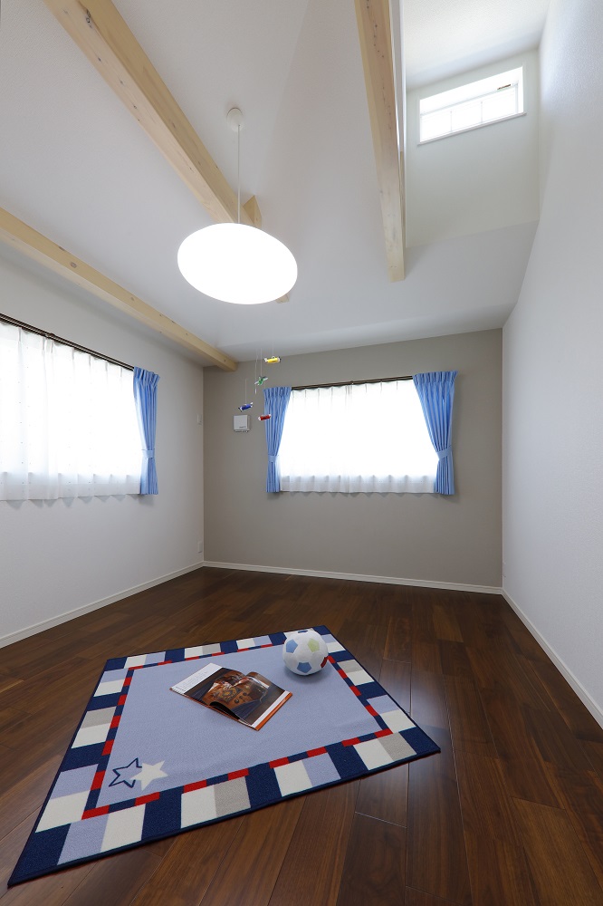 勾配天井にはカジュアルな色の梁をあえて出すことによって広々とした空間を演出。ドーマーを設けた屋根からは明るい光が差し込みます。