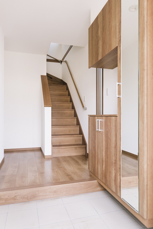 階段を正面から見せる事で、玄関を広々すっきりした印象にさせてくれます。