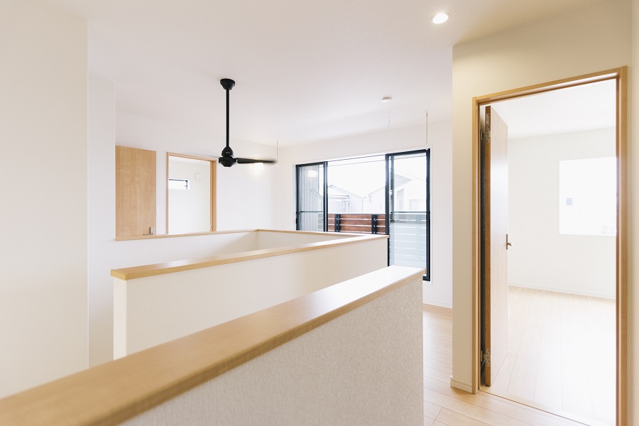 階段を上がった2階ホール。バルコニーに出る大きい掃き出し窓の前には”ホスクリーン”付き。