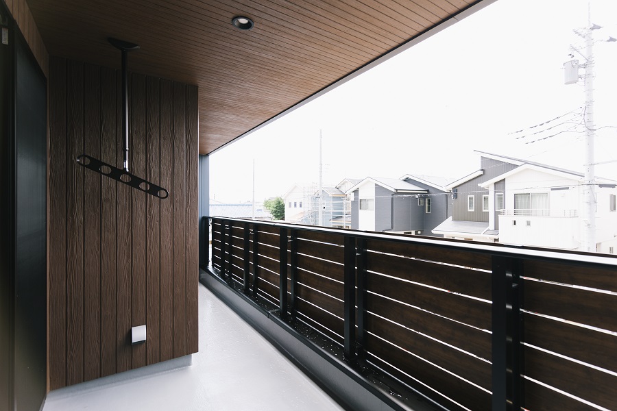 掃き出し窓の外には、天然木を忠実に再現した木目調のポーチタイルを。