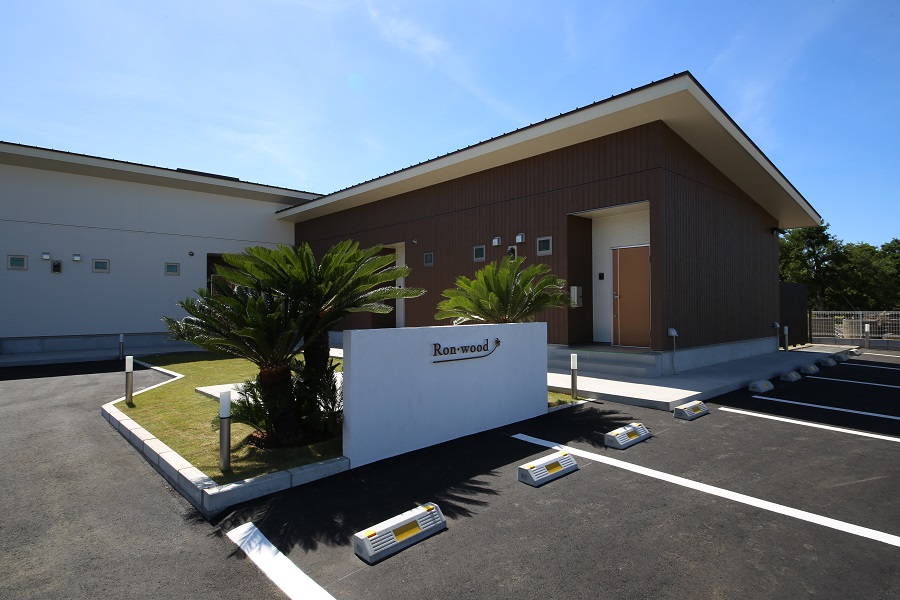 そこに大きな片流れの屋根、白い壁の看板や植栽のソテツなどを合わせる事でリゾート感が生まれます。