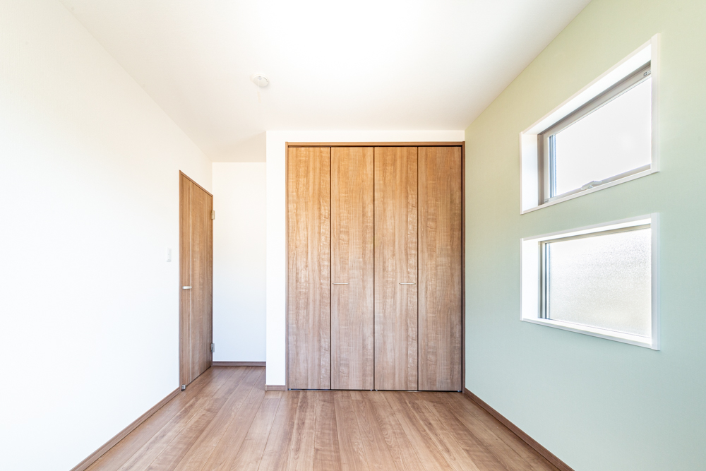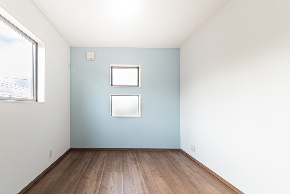 子供部屋には、リラックス効果もある優しい色合いのグリーンとブルーのアクセントクロスを。